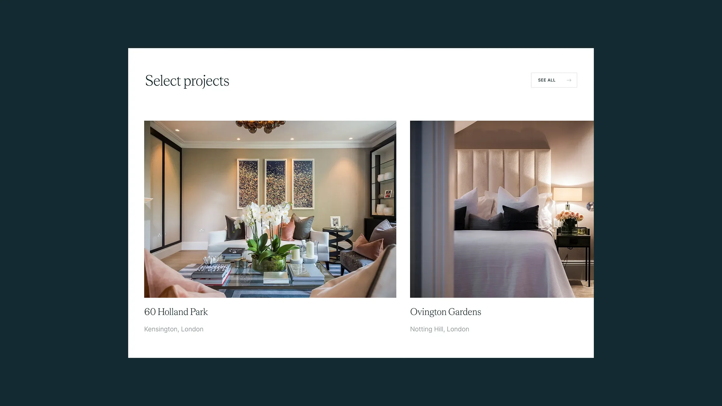 The challenge with the website wasn’t showing off TSF’s amazing work— that was the easy part. But rather how to demonstrate their services concisely and effectively. TSF’s two main services are the SF Collections (levelled, preprepared design packages aimed at different budgets) and SF Studio (full service interior design). Each of which needed to be communicated as different levels of service.