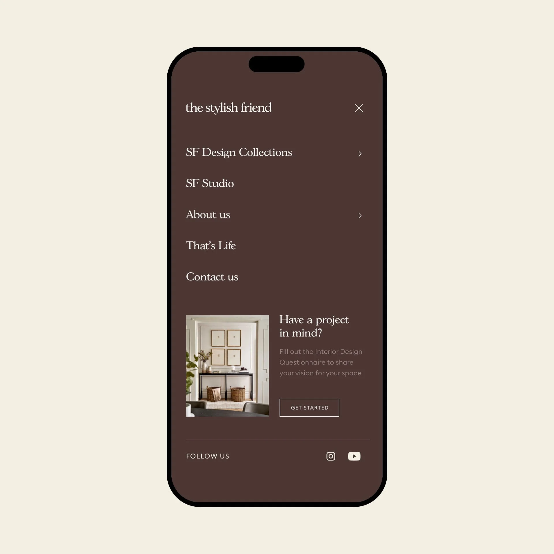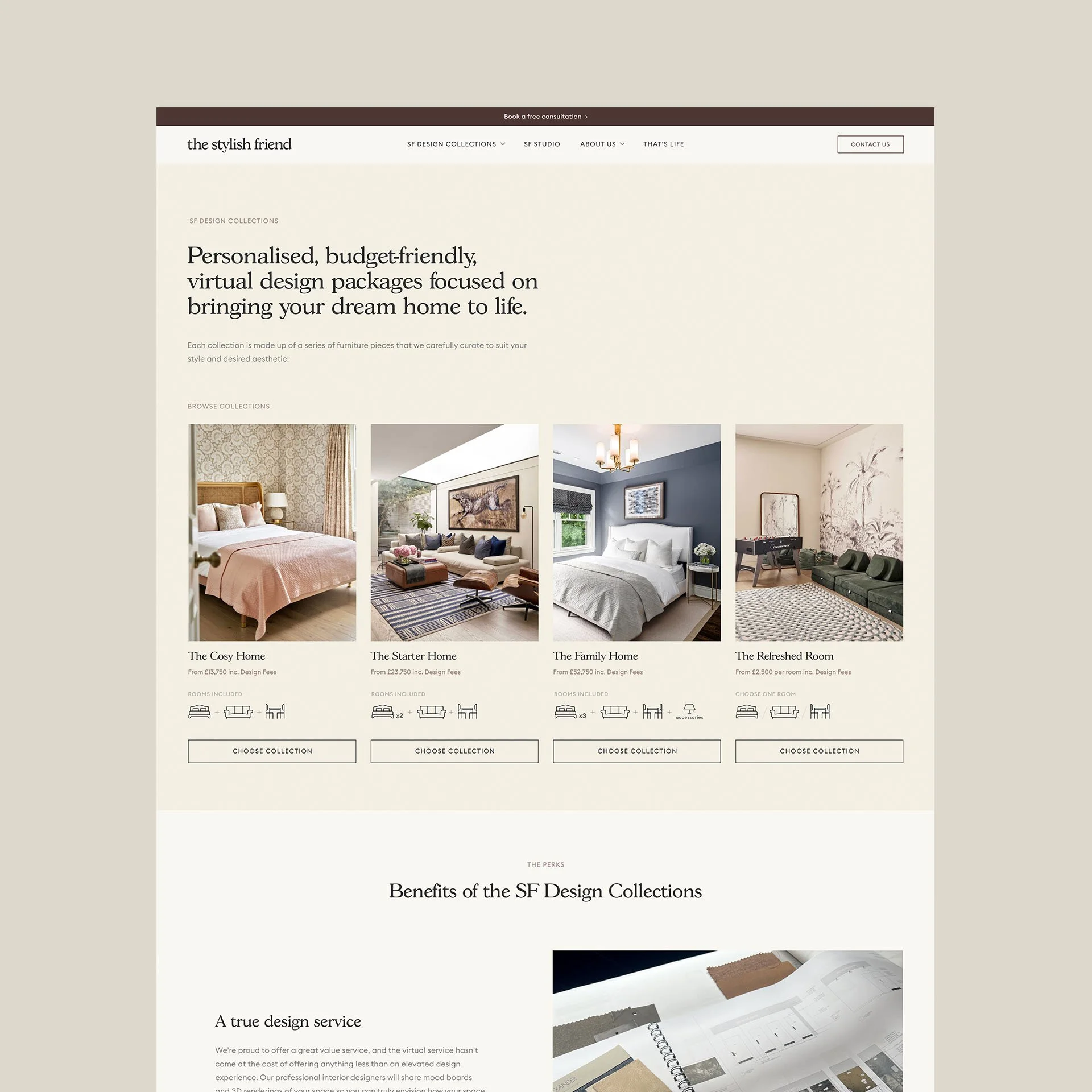 The challenge with the website wasn’t showing off TSF’s amazing work— that was the easy part. But rather how to demonstrate their services concisely and effectively. TSF’s two main services are the SF Collections (levelled, preprepared design packages aimed at different budgets) and SF Studio (full service interior design). Each of which needed to be communicated as different levels of service.